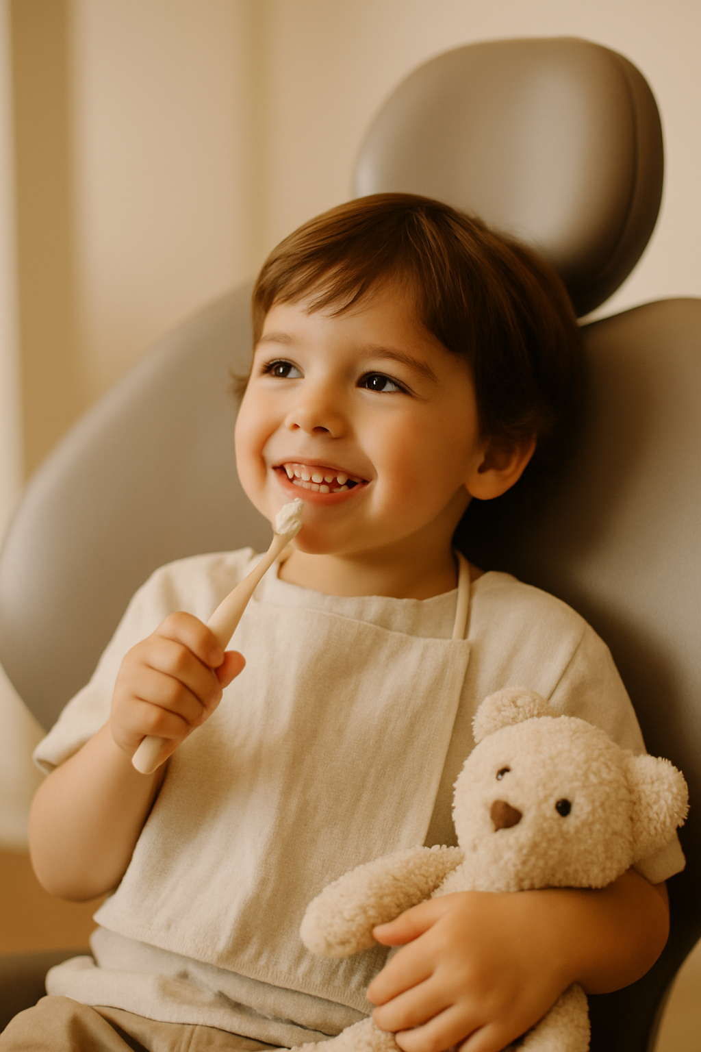 We recommend scheduling your child’s first dental visit around their first birthday or when their first tooth erupts. Early visits help build comfort and catch potential concerns early.